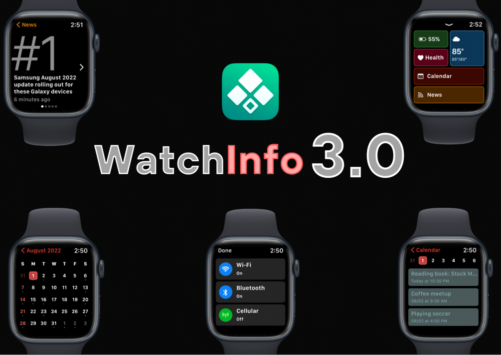 • Displays battery, health, weather, calendar, connectivity, and news/RSS infomation.