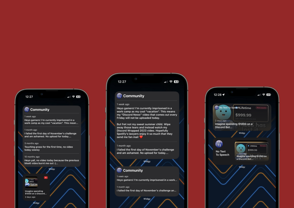 WidgyTube is a widget pack that displays newest video uploads and community posts from a specific channel on Apple devices, including iOS, iPadOS, and macOS, using Widgy, a widget customization application.